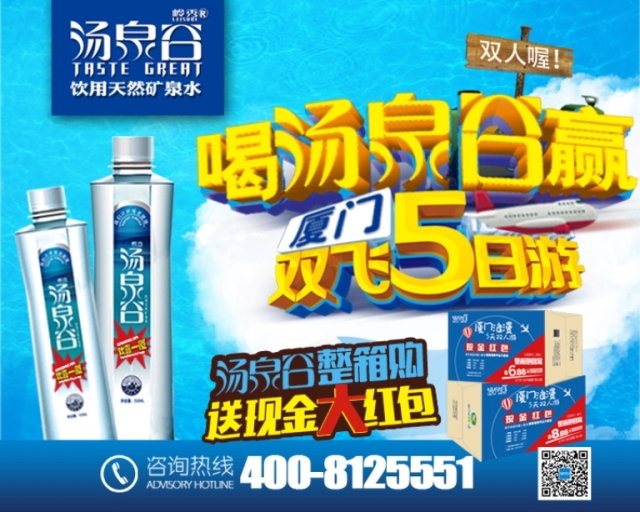 刮开汤泉谷VIP338ml/VIP530ml饮用天然矿泉水瓶身背标涂层,扫描二维码即有机会获得厦门浪漫5日双人游或微信红包。