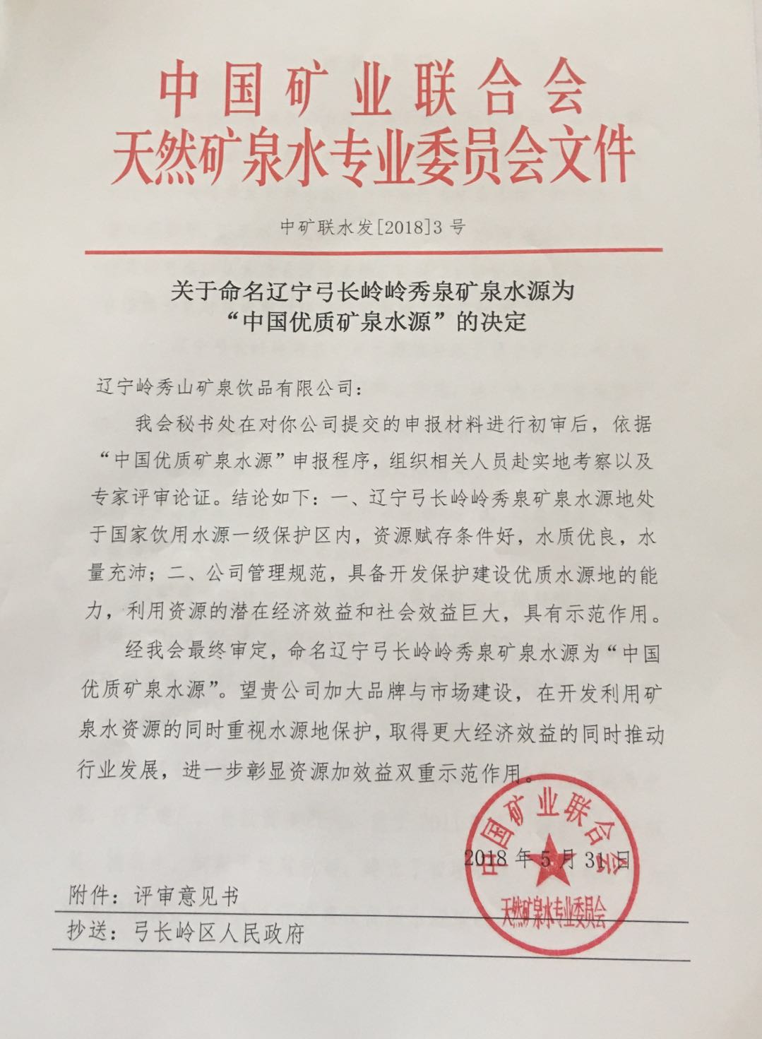 “岭秀泉”天然矿泉水源成功申报中国优质矿泉水源