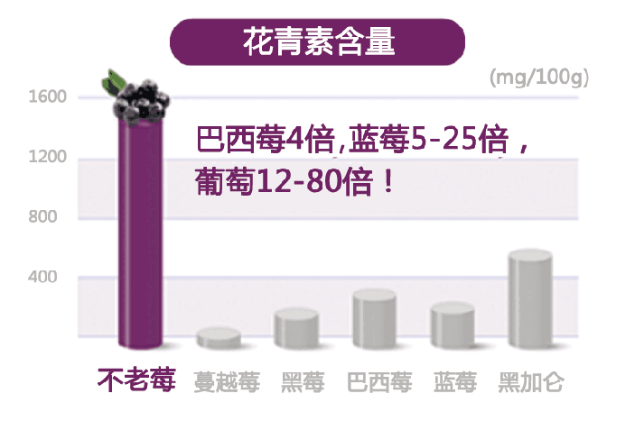 不老莓的花青素是目前已知含量一级高的超级食品,花青素就是纯天然的抗衰老的营养补充剂,研究证实,花青素是当今人类所发现最有效的抗氧化剂,它的抗氧化性能比维生素E高出五十倍,比维生素C高出二十倍。它对人体的生物有效性是100%,服用后二十分钟就能在血液中检测到。