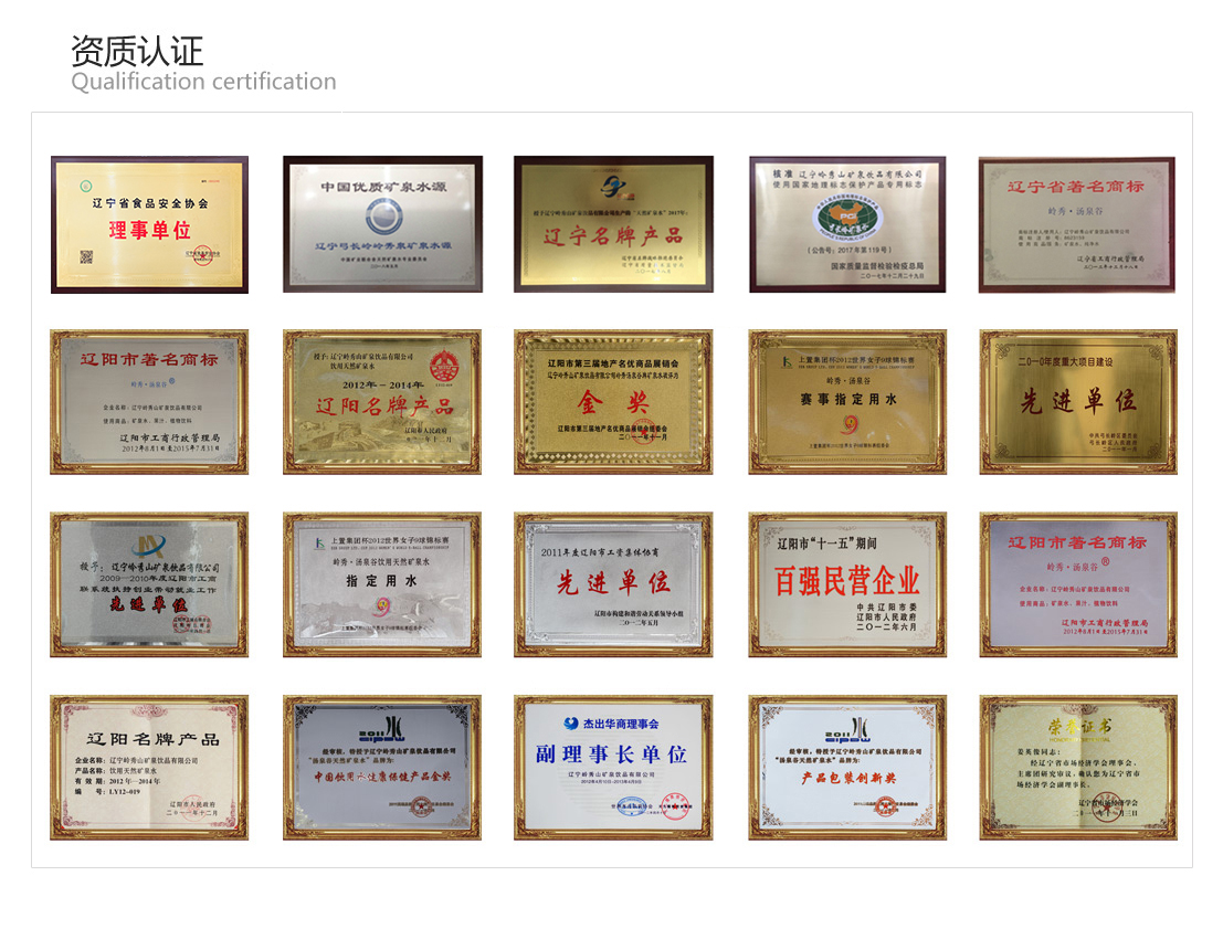 2018年被中国矿业联合会天然矿泉水专业委员会评为中国优质矿泉水源地“岭秀泉”荣誉称号、被评选为“辽宁礼物”、被评为“辽宁省食品安全协会理事单位”。